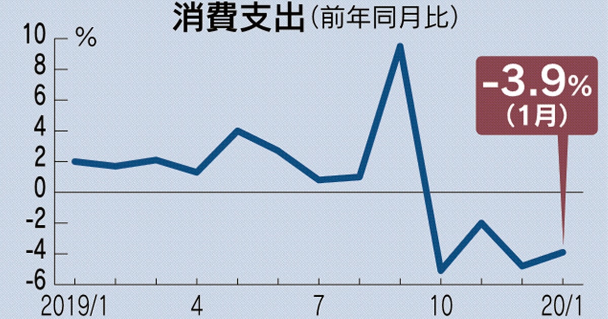 日経のニュースのグラフを見ると、10月からやばい。そこから4ヶ月マイナスとのこと。2月以降はコロナショックでさらに悲惨になることが予想される。増税の影響少ないとか言ってる人、どこに目をつけてるのか。